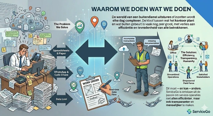 Dit moet -- en kan -- anders. ServiceGo is ontstaan uit de passie om service-operaties niet allen efficiënter, maar ook transparanter en menselijker te maken.